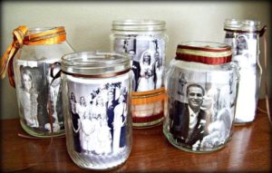 Um porta-retrato bem simples de fazer, criativo e que fica lindo na decoração de qualquer ambiente é usando potes de vidro. Basta imprimir uma foto e colocar dentro do pote. Decore a tampa, para ficar mais bonito, e coloque uma vela à bateria para iluminar dentro do pote. Fica lindo!
